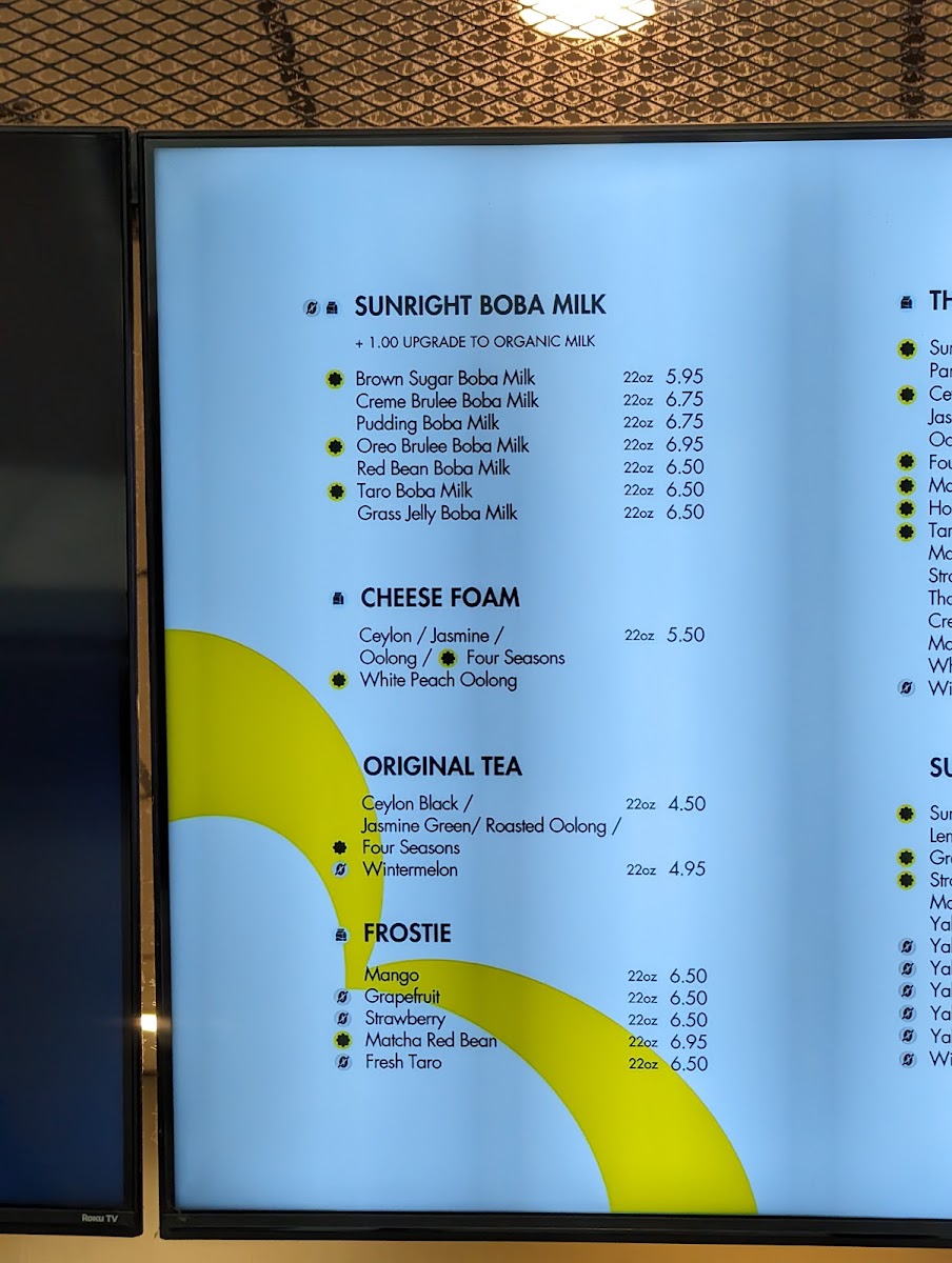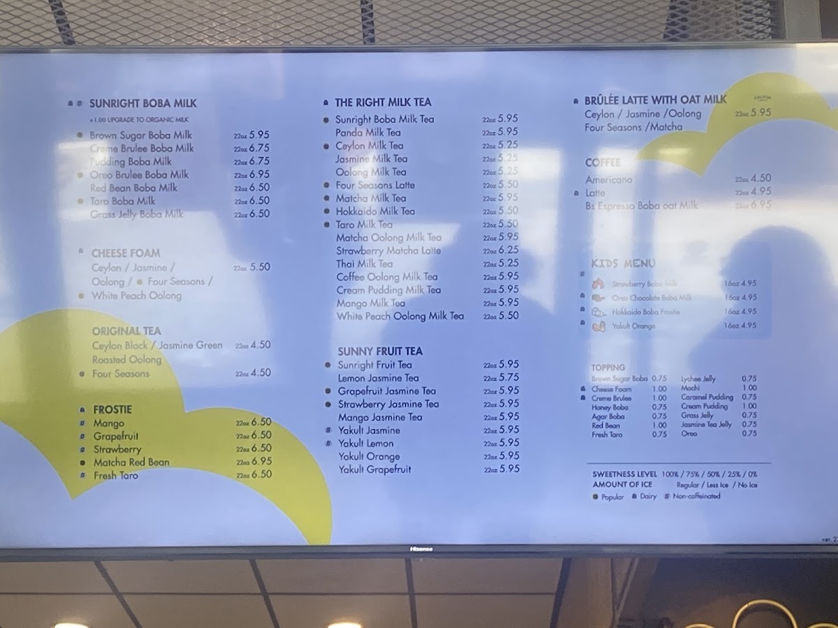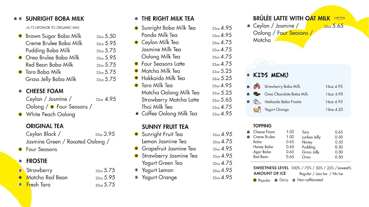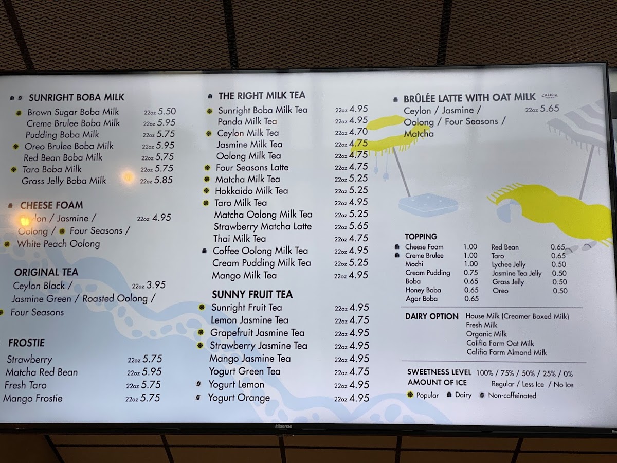 From a reviewer’s perspective, the menu at Sunright Tea Studio - Sawtelle impresses with both variety and creativity, offering something for every kind of tea lover. Standout options in the Fruit Tea category like Grapefruit Jasmine Tea, Lemon Jasmine Tea, and Sunright Fruit Tea deliver refreshing citrus-forward flavors, while the Cheese Foam selections such as Jasmine Cheese and White Peach Oolong Cheese add a rich, savory twist. The New Releases, including Tie Guan Yin Oolong Tea and Matcha Latte W/ Pistachio Cheese Foam, highlight the shop’s innovation, while the Yakult Series-featuring Green Tea Yakult and Mango Yakult-brings a tangy probiotic kick. For those craving indulgence, the Oreo Brulee Boba Milk and Brown Sugar Boba Milk in the Sunright Brown Sugar lineup are especially satisfying. Classic drinkers can rely on staples like Ceylon Black Tea and Jasmine Green Tea, while the Matcha Series and Frosties, such as Strawberry Matcha Latte and Fresh Taro Frostie, cater to dessert-style preferences. Overall, the menu feels thoughtfully curated, balancing traditional teas with modern, dessert-inspired creations that keep customers coming back.