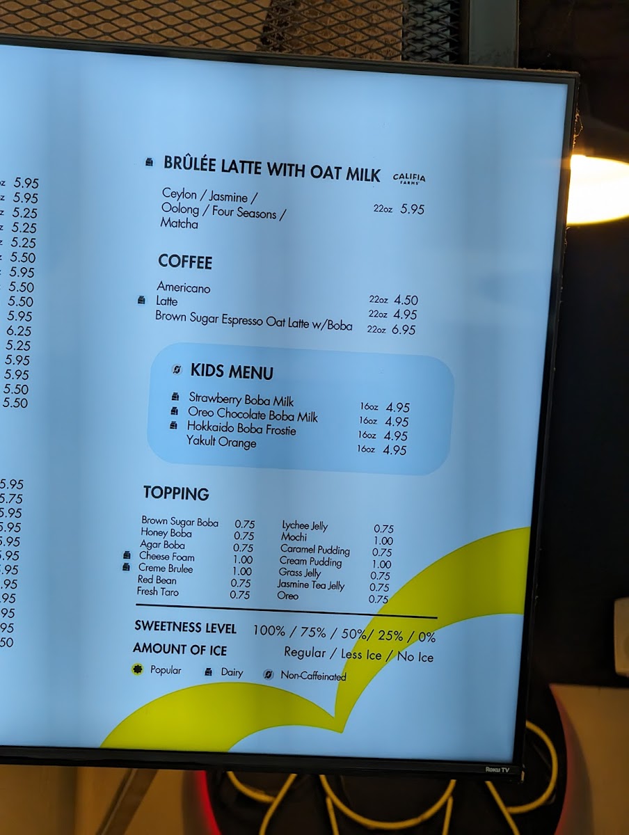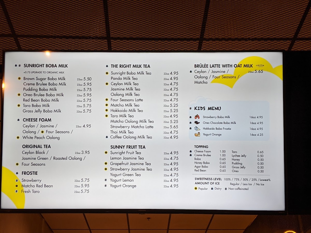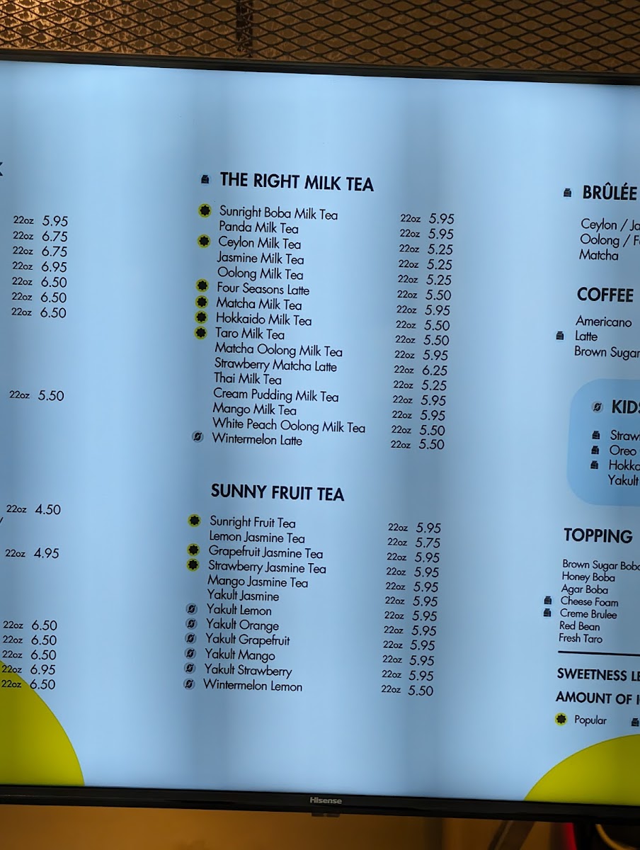 From a reviewer’s perspective, the menu at Sunright Tea Studio - Sawtelle impresses with both variety and creativity, offering something for every kind of tea lover. Standout options in the Fruit Tea category like Grapefruit Jasmine Tea, Lemon Jasmine Tea, and Sunright Fruit Tea deliver refreshing citrus-forward flavors, while the Cheese Foam selections such as Jasmine Cheese and White Peach Oolong Cheese add a rich, savory twist. The New Releases, including Tie Guan Yin Oolong Tea and Matcha Latte W/ Pistachio Cheese Foam, highlight the shop’s innovation, while the Yakult Series-featuring Green Tea Yakult and Mango Yakult-brings a tangy probiotic kick. For those craving indulgence, the Oreo Brulee Boba Milk and Brown Sugar Boba Milk in the Sunright Brown Sugar lineup are especially satisfying. Classic drinkers can rely on staples like Ceylon Black Tea and Jasmine Green Tea, while the Matcha Series and Frosties, such as Strawberry Matcha Latte and Fresh Taro Frostie, cater to dessert-style preferences. Overall, the menu feels thoughtfully curated, balancing traditional teas with modern, dessert-inspired creations that keep customers coming back.